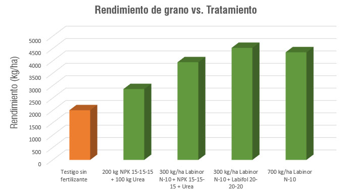 En base a estos resultados, afirmamos que el biofertilizante LABINOR N-10 es agronómicamente más eficiente en la evaluación del rendimiento en un cultivo de maíz respecto la aplicación de fertilizantes químicos convencionales, así como en comparación de la no aplicación de fertilizante.