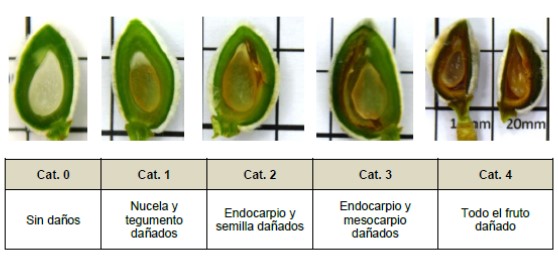 Al cabo de 48 horas de la simulación de la helada, se observó el grado de afectación de cada uno de los frutos. Para ello, se establecieron 5 categorías según el tipo de daños observados en base a la metodología específica de evaluación de daños citada en “Síntomas específicos provocados por las heladas primaverales en frutales de pepita y hueso” del MAPA (1998).