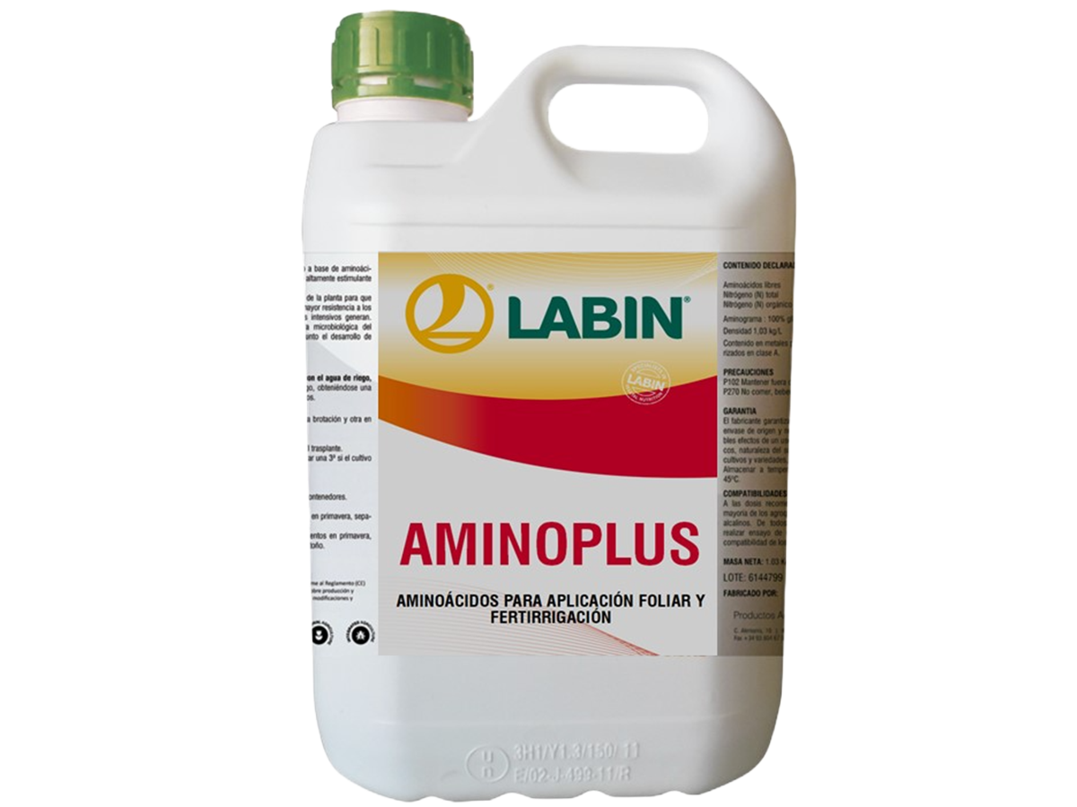 LABIN AMINOPLUS es un producto líquido que se obtiene de la hidrólisis controlada de proteínas vegetales naturales. Contiene aminoácidos de bajo peso molecular, adecuados para su perfecta asimilación, tanto por vía radicular como foliar. Mejora el crecimiento, floración y fructificación, consiguiendo un aumento del desarrollo del fruto y adelanto de la maduración. Es uno de los mejores BIOACTIVADORES actuales.