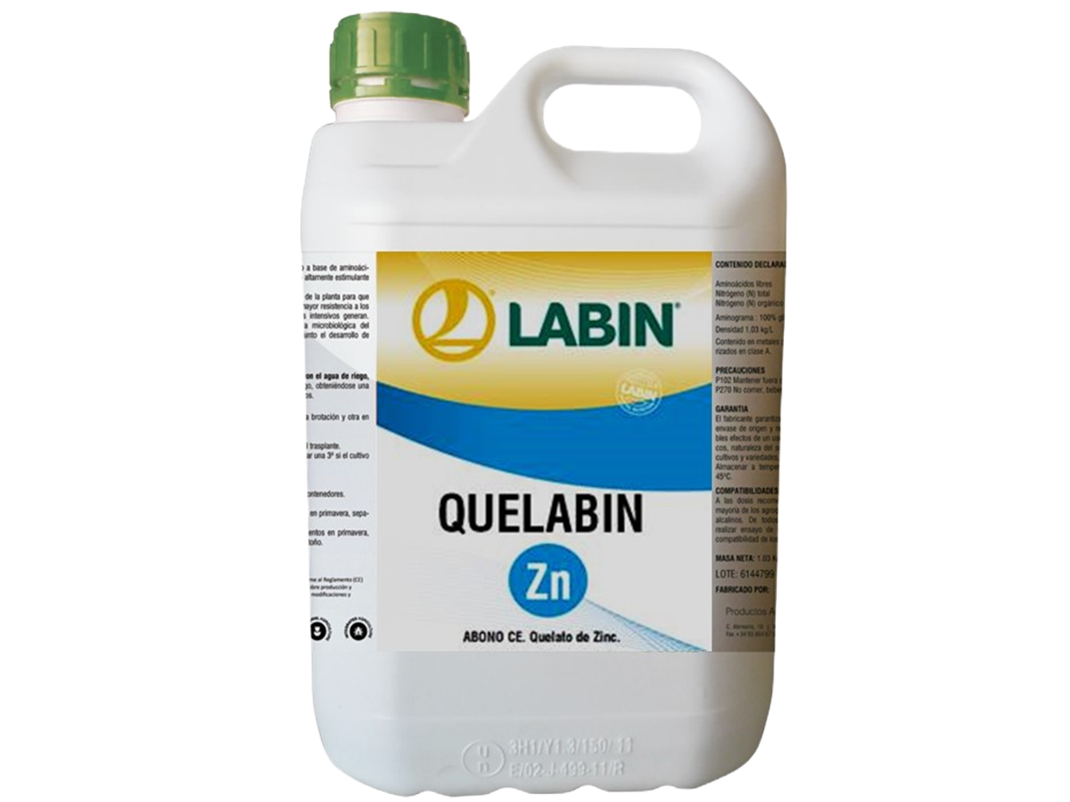 QUELABIN Zn se utiliza para aportar zinc en forma totalmente asimilable, resistente a cualquier tipo de bloqueo, para prevenir y curar cualquier carencia en este elemento.
